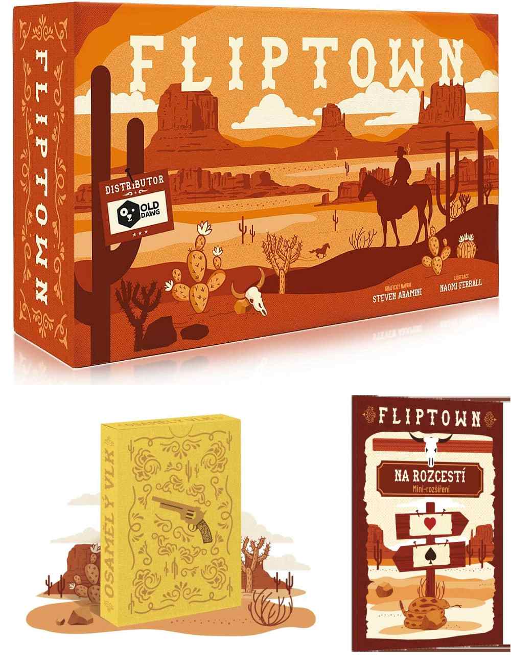 Základní hra Fliptown (CZ) a rozšíření Osamělý vlk a Na rozcestí v jednom balíčku.