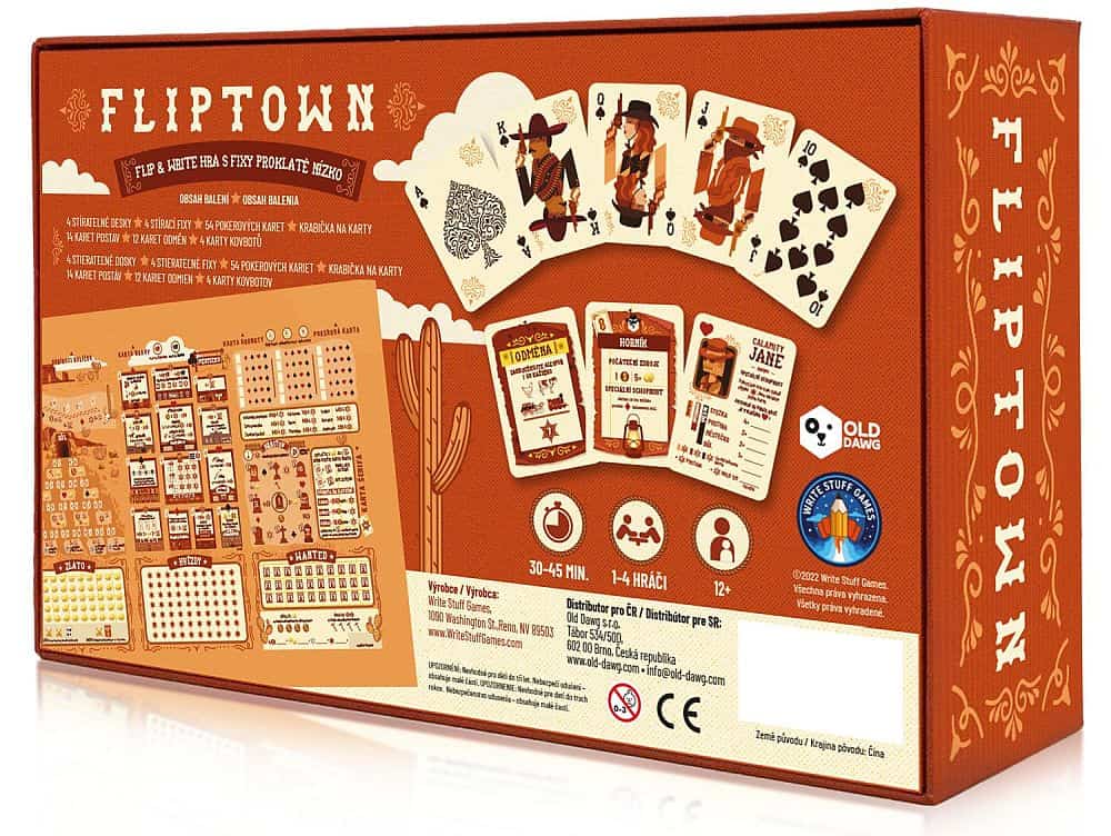 Fliptown je hra typu flip and write, ve které se snažíte získat hvězdy prozkoumáváním města divokého západu. Hra využívá standardní pokerový balíček k řízení hry ve stylu otevřeného světa spolu s mazatelnými deskami, které slouží jako mapa každého hráče.