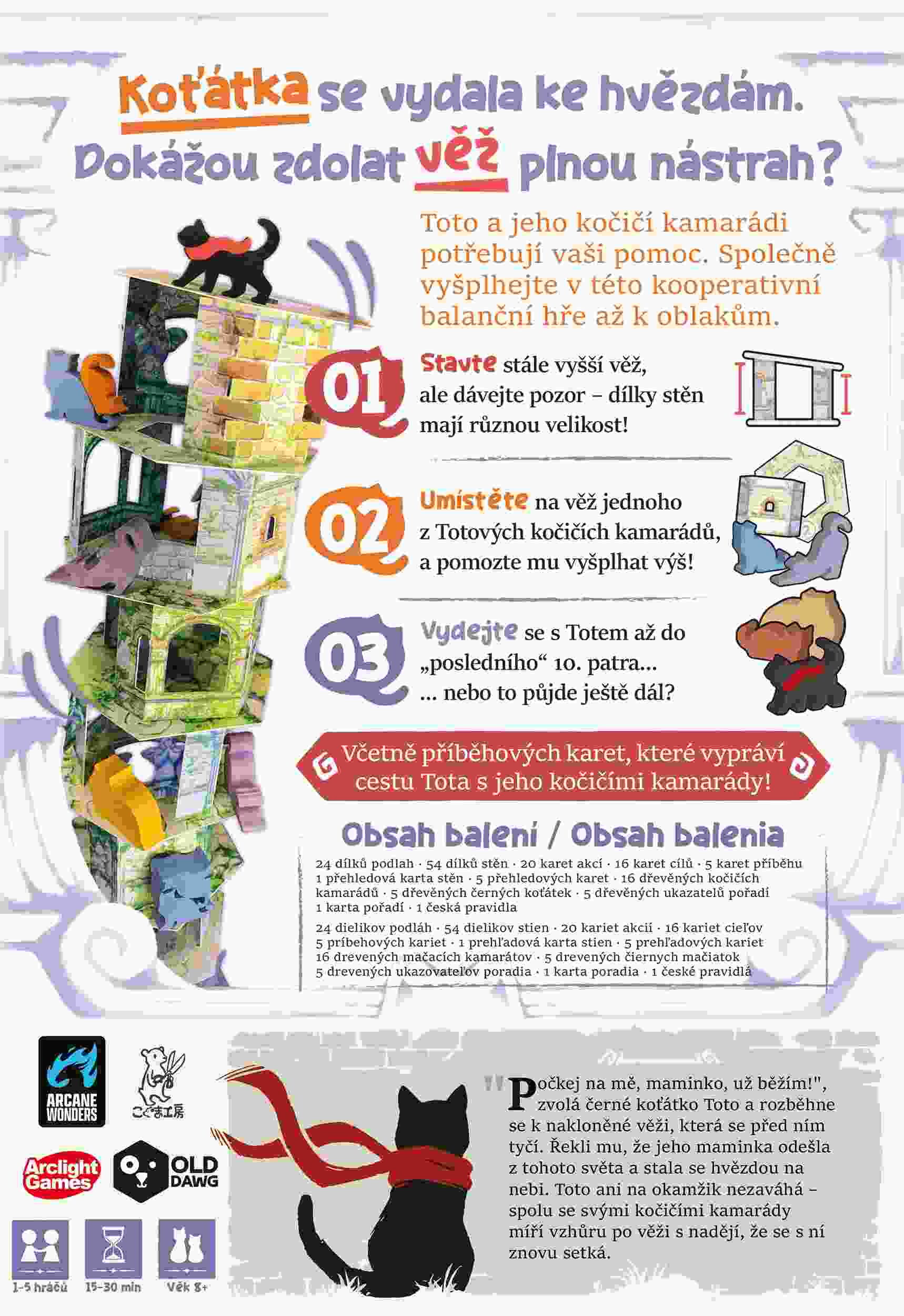 V rodinné dexterity hře Koťátko, nespadni! budete společně pomáhat Totovi na jeho cestě vzhůru k hvězdám. Věž si ale musíte postavit sami – z nestejně vysokých zdí a s kočičími přáteli, kteří se neustále pohybují. Někdy vám pomůžou vyrovnat vratkou stavbu, jindy vám ale zkomplikují přidávání nových pater. Každé kolo se rozhodujete, zda budete stavět věž dál, nebo podstoupíte dovednostní výzvu, která ukáže, jak pevnou máte ruku.