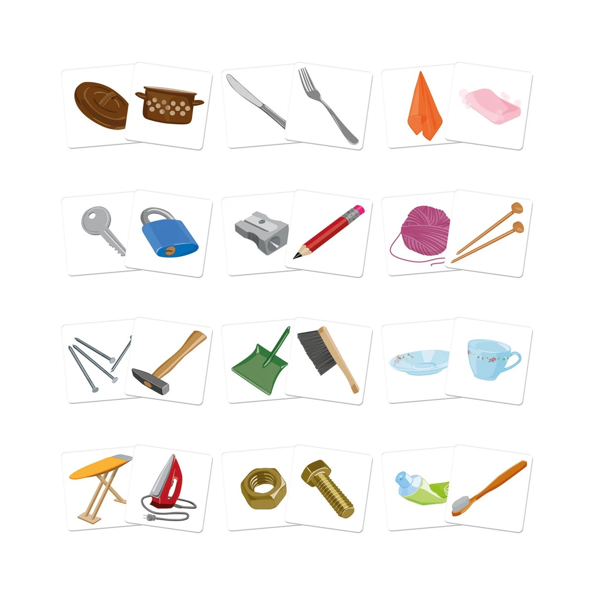 Hledání párů předmětů z domácnosti, které k sobě logicky patří je netradiční a velmi zábavný způsob této hry. Karty se ovšem dají využít i k dalším aktivitám.