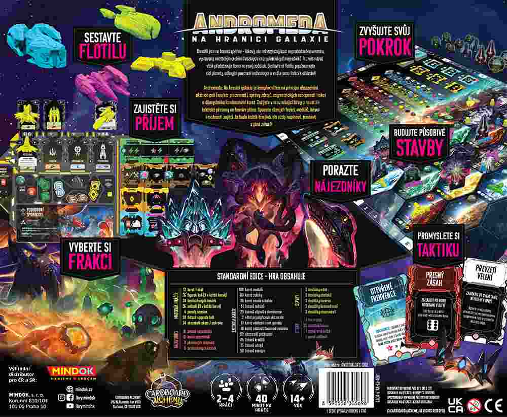 Andromeda: Na hranici galaxie je komplexní hra na principu obsazování akcních polí (worker placement), správy zdroju, asymetrických schopností frakcí a dumyslného kombinování karet. Zažijete v ní vzrušující bitvy a neustálé taktické presuny na herním plánu. Spousta ruzných frakcí, modulu, lokací i možností zajistí, že bude každá hra jiná, ale vždy napínavá, poutavá a plná zvratu!