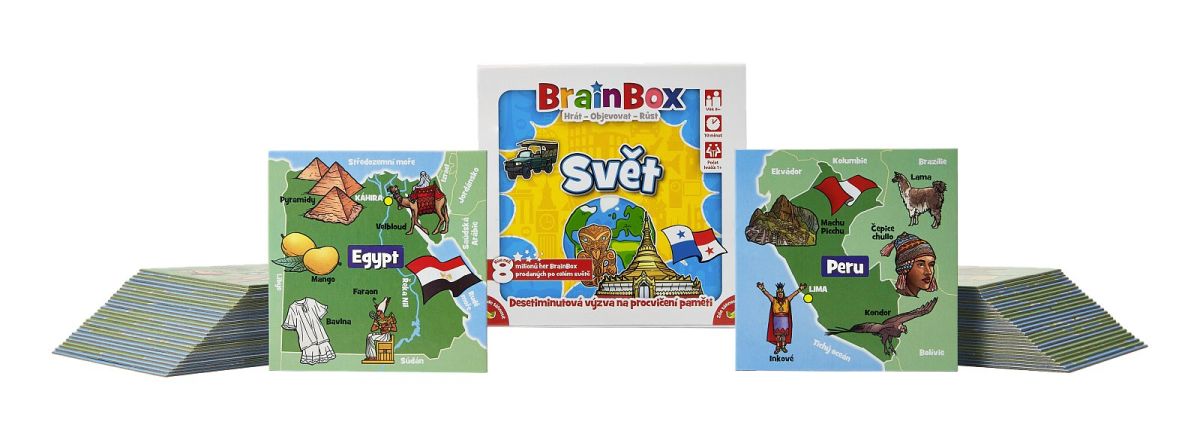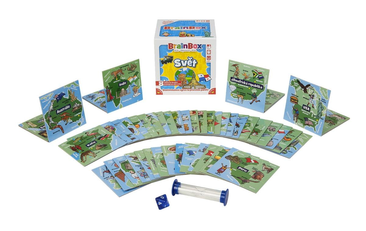 BrainBox Svět obsahuje 55 hracích karet s nejrůznějšími zeměmi: od Velké Británie po USA, od Řecka po Ghanu, od Thajska po Mexiko a tak dále. Na každé kartě je mapa země s vyznačeným hlavním městem a ručně malovanými obrázky toho nejzajímavějšího, co je pro danou zemi typické.