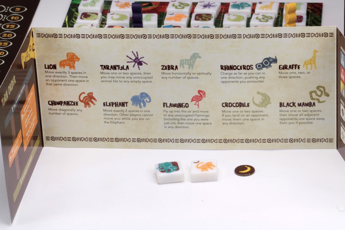 Players start on a board full of African animals, each with their own movement abilities. Each player can either move as normal or follow the wisdom of the animals, earning that animal's favor in the process and collecting its chip. Some animals will make movement easier, while others can affect how opponents move, giving a lot of depth to this deceivingly simple strategy game. As the game progresses, fewer and fewer animals remain, making choices that much more important.