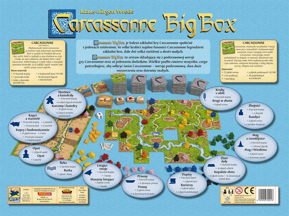 Ve veliké krabici najdou všichni fanoušci Carcassonne legendární základní hru, ta nejoblíbenější rozšíření - Hostince a katedrály a Kupci a stavitelé a navíc devět dalších minirozšíření. Jednotlivá rozšíření se dají hrát každé zvlášť, ale i libovolně kombinovat dohromady. Máte tak po ruce vždy takovou kombinaci rozšíření, kterou si nejlépe užijete.