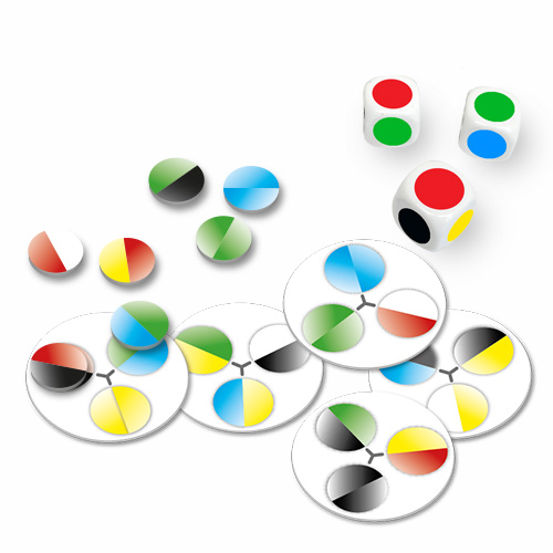 Další postřehová hra od Maureen Hiron. První na řadě hází všemi kostkami najednou a dle nastalé kombinace hledají všichni hráči správný žeton. Hráč, který najde žeton jako první jej umístí na jednu ze 7 karet hracího plánu. Žeton musí umístit na stejně barevné kolečko. Pokládá ho rubem nahoru, aby byla viditelná strana se 4 barvami, a nasměruje svou barvu ke středu karty (tam kde je čárka). Tím určuje, že je žeton jeho a získává body dle tabulky.