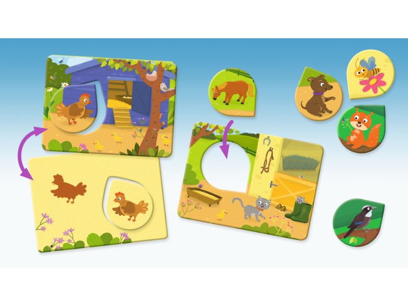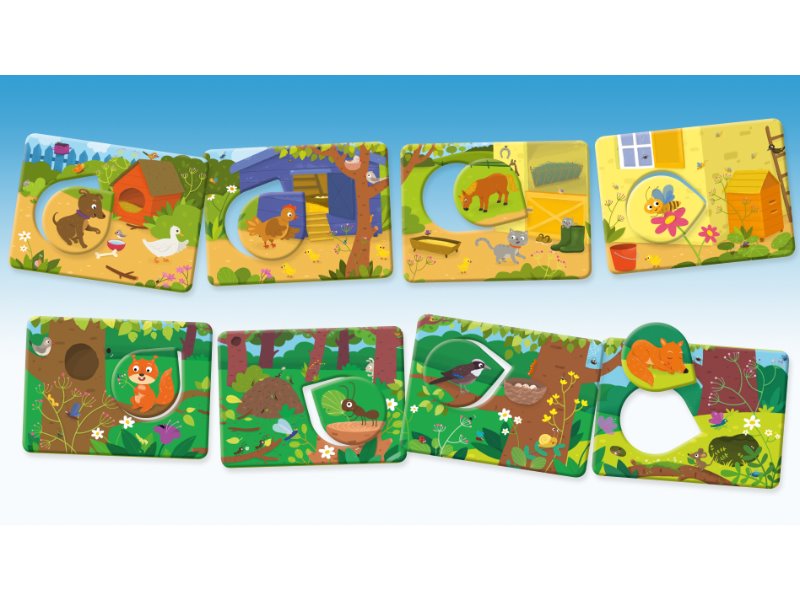 3 různé varianty hry (skládačka, hra se stíny, otázky a odpovědi) procvičují slovní zásobu, pozorovací schopnosti, jemnou motoriku a soustředění. Malé děti si v interakci s rodiči rozšiřují vědomosti ze světa zvířat.