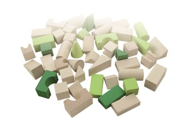 Inovovaná stavebnice skládající se z různých tvarů a velikostí dřevěných dílků v zeleno-přírodním barevném provedení. Kromě klasických krychlí, kvádrů a válečků obsahuje také jehlany, mosty a další tvary. Díky tomu lze postavit úžasné stavby.