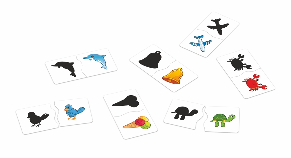 Tato hra za pomoci kartiček s obrázky a stíny pomáhá dětem poznávat a pojmenovávat jednotlivé věci nebo zvířátka na kartičkách.