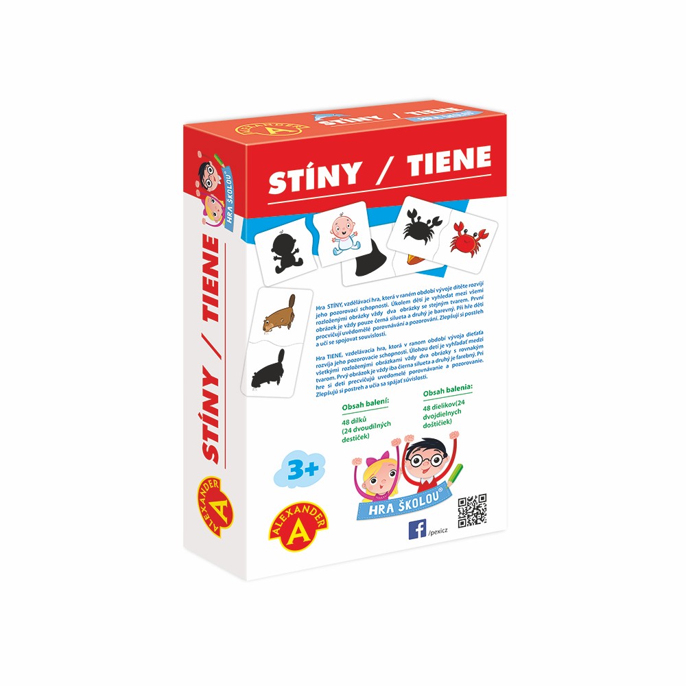 HRA ŠKOLOU® - STÍNY je naučná hra pro děti od 3 let, pomocí níž se děti učí zábavnou formou rozvíjet své schopnosti. Učí se rozpoznávat tvary stínů a přiřazovat je ke správnému obrázku, a tím si zlepovat postřeh a soustředění.