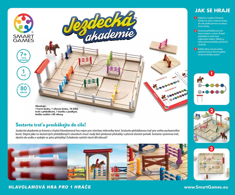 Jezdecká akademie je krásná a chytrá hlavolamová hra nejen pro všechny milovníky koní. Sestavte překážkovou trať pro svého parkurového koně. Stejně jako ve skutečných překážkových závodech musí i tady kůň překonat překážky v přesně daném pořadí. Sestavte správnou trať, skočte do sedla a vydejte se přes překážky! Zvládnete vyřešit všech 80 rébusů?