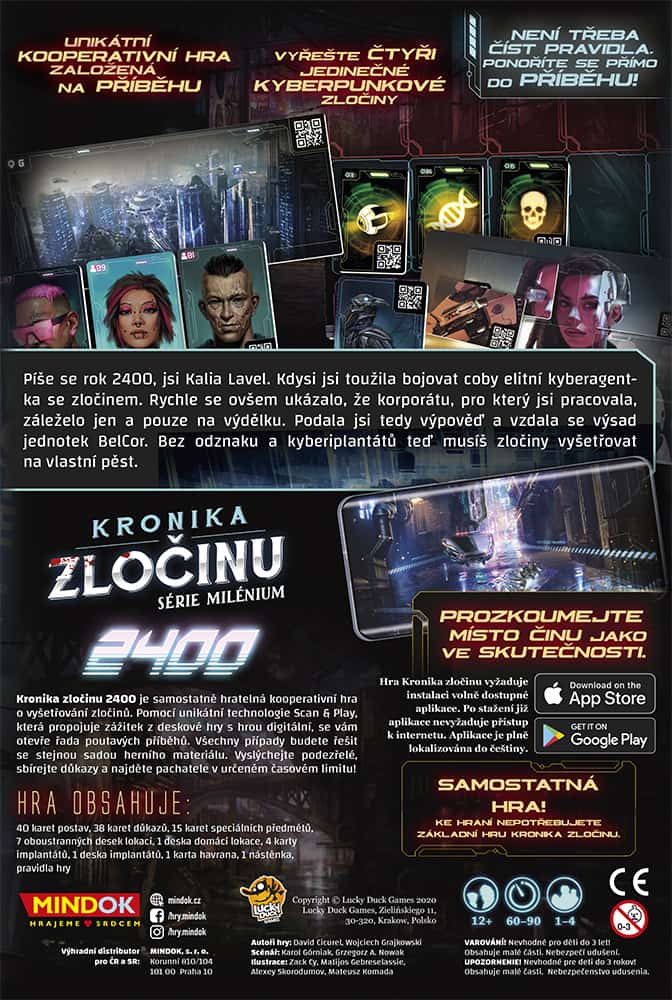 Kronika zločinu 2400 je samostatně hratelná kooperativní hra o vyšetřování zločinů. Pomocí unikátní technologie Scan & Play, která propojuje zážitek z deskové hry s hrou digitální, se vám otevře řada poutavých příběhů. Všechny případy budete řešit se stejnou sadou herního materiálu. Vyslýchejte podezřelé, sbírejte důkazy a najděte pachatele v určeném časovém limitu!