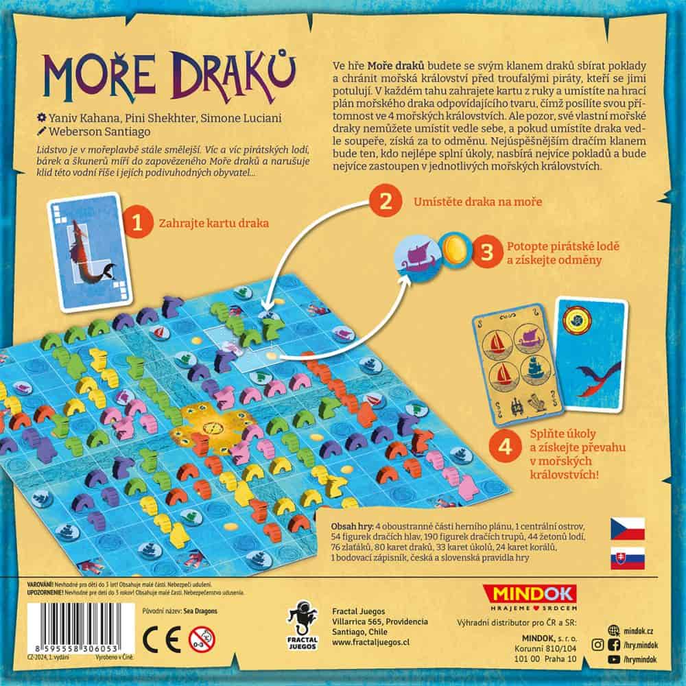 Ve hře Moře draků budete se svým klanem draků sbírat poklady a chránit mořská království před troufalými piráty, kteří se jimi potulují. V každém tahu zahrajete kartu z ruky a umístíte na hrací plán mořského draka odpovídajícího tvaru, čímž posílíte svou přítomnost ve 4 mořských královstvích.