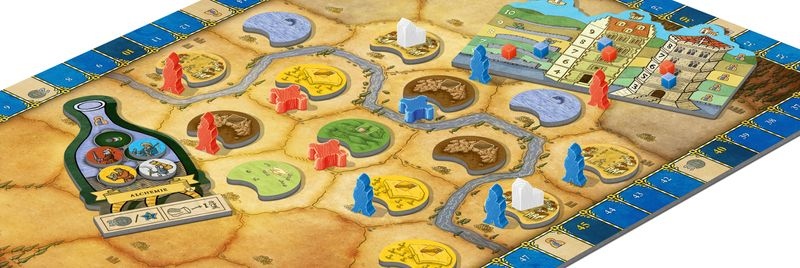 "The King's Favor" is shorter, simpler, and more suitable as an introduction to the game. Over five eras, certain tasks have to be fulfilled by the end of each era, and those who fail to do so will drop out mercilessly. The threat of having to end the game prematurely provides a constant thrill, but all tasks are achievable, so that (usually) all players experience the end of the fifth era — but those who have concentrated only on the tasks will be punished because at this point everyone's achievements will be compared in the king's castle, and you will receive victory points for territory size, buildings, goods, and coins.