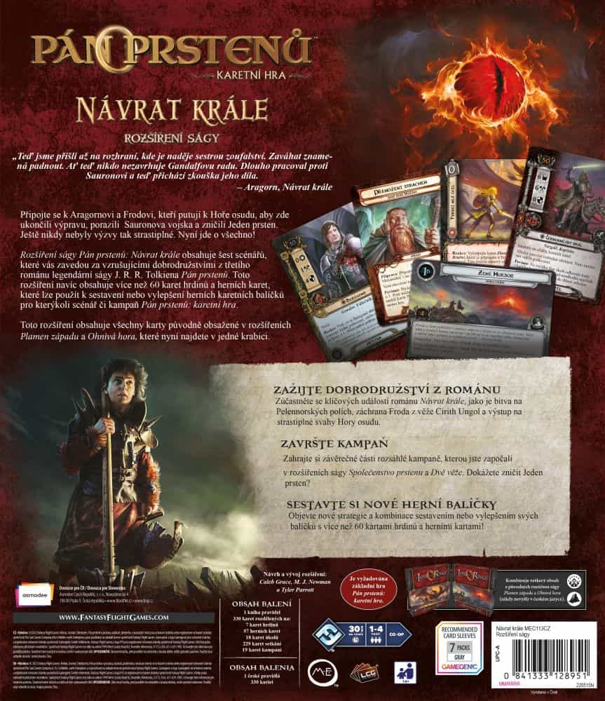 Rozšíření ságy Pán prstenů: Návrat krále obsahuje šest scénářů, které vás zavedou za vzrušujícími dobrodružstvími z třetího románu legendární ságy J. R. R. Tolkiena Pán prstenů. Toto rozšíření navíc obsahuje více než 60 karet hrdinů a herních karet, které lze použít k sestavení nebo vylepšení herních karetních balíčků pro kterýkoli scénář či kampaň Pán prstenů: karetní hra.