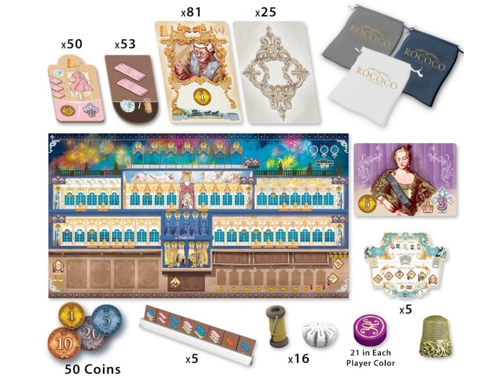 Rokoko je desková hra v euro stylu, která zajímavým způsobem pracuje s mechanismem deck-buildingu (budování vlastního balíčku karet v průběhu hry). Každé kolo zde budete hrát karty svých pracovníků, a tito pracovníci tak budou provádět svěřené úkoly: najímat nové pracovníky, nakupovat zdroje, vyrábět šaty či obleky nebo investovat do slavnostních dekorací. Ovšem ne každý z vašich pracovníků bude vhodný na všechny úkoly, takže bude třeba mezi nimi vybírat a chytře je vést. Nemluvě o tom, že každý z nich má speciální bonus a některé takové bonusy vám poté mohou přidávat body prestiže.