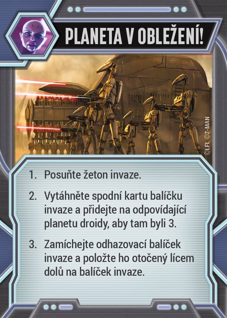 Jediové musí Republiku bránit před třemi typy nepřátel: bitevními droidy, blokádami a zlosyny. Droidi se hromadí na planetách a blokády chrání nepřátele na odpovídající planetě. V každé hře budete čelit jednomu zlosynovi. Každý zlosyn má tabulku, kde je uvedena hodnota jeho zdraví a všechny speciální schopnosti, a na jejíž zadní straně jsou uvedena pravidla finále a postup, kterým lze dosáhnout celkové výhry. Každý zlosyn má svůj balíček karet, který určuje, jak budou v průběhu hry jednat.