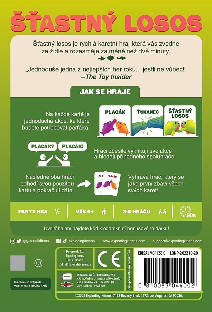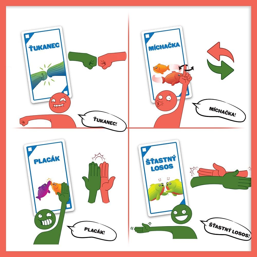 Šťastný losos je rychlá, pohybová a HLASITÁ hra, která vás rozesměje za méně než dvě minuty. Takže vykliďte prostor, zbavte se židlí a pokud vám srdeční tep vyskočí na 120 úderů za minutu, nejspíš to děláte dobře.
