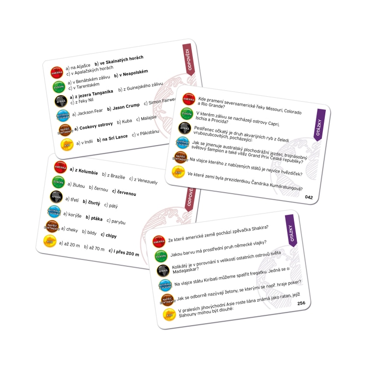 V této vědomostní hře najdete 2400 otázek týkajících se planety Země a jejích obyvatel. Otázky jsou rozděleny do 6 okruhů podle jednotlivých kontinentů: Evropa, Asie, Afrika, Severní a Jižní Amerika, Austrálie a Oceánie a kategorie Napříč kontinenty.