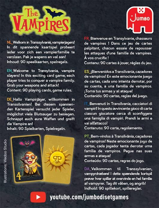 Welcome to Transylvania, vampire hunters! This is where the most feared (as well as slightly less feared) vampires live. Try to eliminate as many vampires as you can using the cards in your hand. You’ll take turns to play an attack card or an action card. This way you make a cross around an active vampire. But watch out! Only the player holding the right weapon in their hand can complete the cross, and so defeat the vampire and score points. The first player to score 6 (or more) points wins the game!