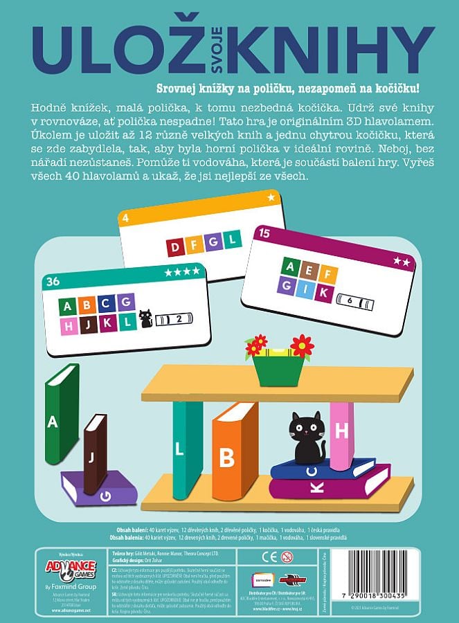 Hodně knížek, malá polička, k tomu nezbedná kočička. Udrž své knihy v rovnováze, ať polička nespadne! Tato hra je originálním 3D hlavolamem. Úkolem je uložit až 12 různě velkých knih a jednu chytrou kočičku, která se zde zabydlela, tak, aby byla horní polička v ideální rovině. Neboj, bez nářadí nezůstaneš. Pomůže ti vodováha, která je součástí balení hry. Vyřeš všech 40 hlavolamů a ukaž, že jsi nejlepší ze všech.
