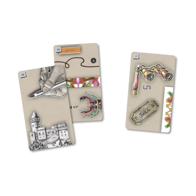 Únikovka Kafka obsahuje: 63 karet, pravidla.