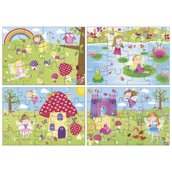 Puzzle pro děti, které obsahuje set 4 skládaček s motivem pohádkových víl.
