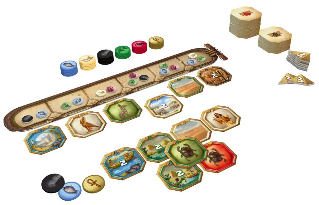 Ankh'or is a quick-playing resource management game in which each player on their turn either collects three types of tokens (with an ankh being a supplemental resource) or buys a tile from a marketplace and adds this tile to their structure, trying to connect tiles of the same color or bearing the same scarab while doing so. By spending an ankh, you can shift tiles in the marketplace and change the cost and type of goods needed to purchase them.