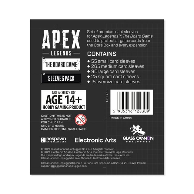 Sada prémiových obalů na karty pro deskovou hru Apex Legends, obsahující obaly, s jejichž pomocí můžete ochránit karty ze základní hry i všech rozšíření.