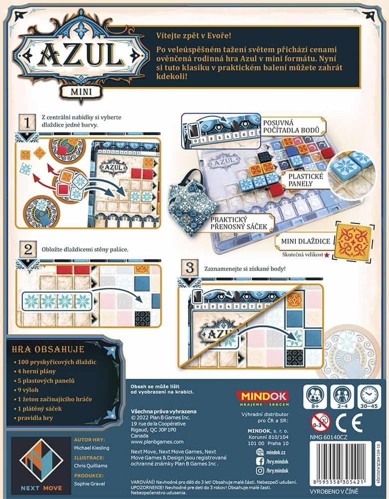 Vítejte zpět v Evoře! Po veleúspěšném tažení světem přichází cenami ověnčená rodinná hra Azul v mini formátu. Nyní si tuto klasiku v praktickém balení můžete zahrát kdekoli!
