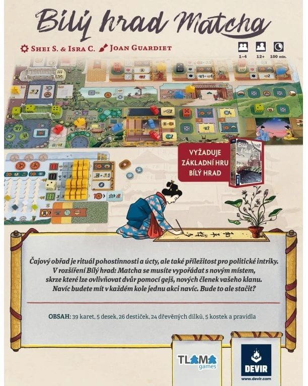 V rozšíření Bílý hrad: Matcha se setkáte s novými místy, kterými můžete získat vliv u dvora. Pokud dostanete členy klanu na dobrá místa v „čašicu“ (čajovně), získáte ještě větší vliv na dění v hradu Himedži. Navíc odehrajete v každém kole další kostku navíc. Bude to ale stačit?