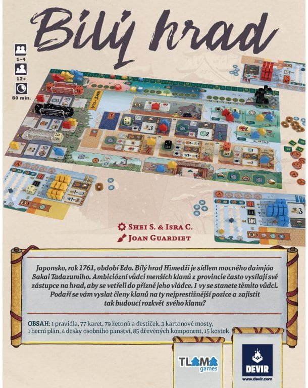 Ve hře Bílý hrad se stanete vůdcem jednoho z těchto drobných klanů a budete usilovat o co největší bodový zisk. Spravujte moudře své zdroje a posílejte své služebníky na správná místa ve správný čas. Jen tak získáte na dvoře větší vliv než ostatní.