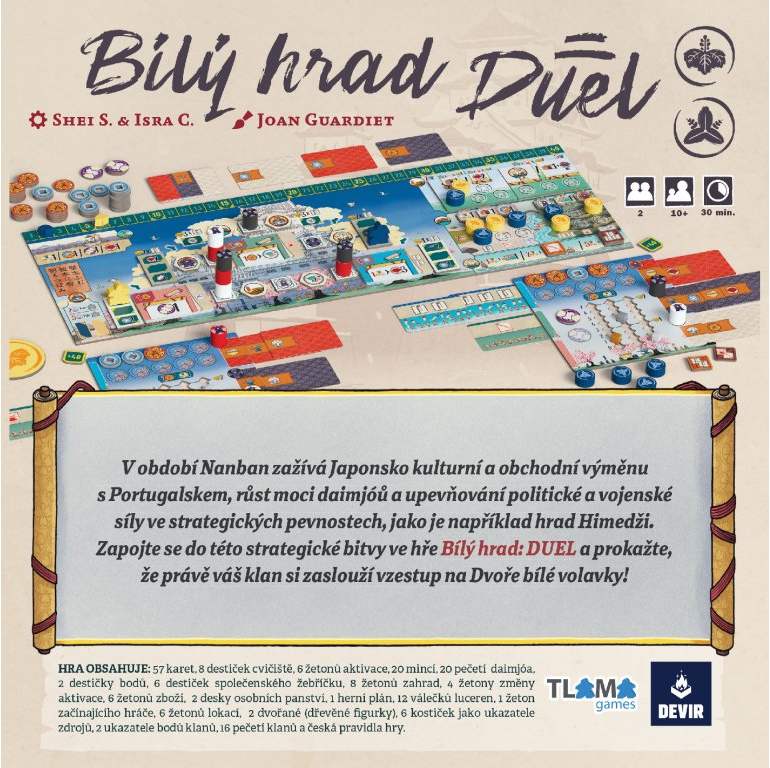 Ve hře Bílý hrad: Duel se přenesete do Japonska 16. století, kdy nečekaný příchod Portugalců na ostrov Tanegašima odstartoval období Nanban – století intenzivního kulturního a obchodního kontaktu se Západem. Do země proudily lodě naložené mušketami, hedvábím a cukrem, zatímco Japonsko vyváželo stříbro z dolů Iwami Ginzan. Tento výměnný obchod posílil mocenské ambice jednotlivých daimjóů, kteří soupeřili o vliv a prestiž. V centru tohoto zápasu stál majestátní hrad Himedži – Bílá volavka – strategická pevnost, kterou daimjóové vylepšovali díky novým technologiím a bohatství ze zahraničí. Hra vás vtáhne do tohoto období soupeření, diplomacie a budování moci.