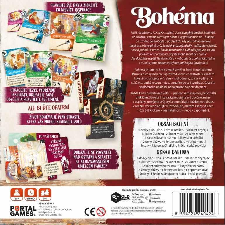 Bohéma spojuje krásné výtvarné zpracování s výraznou atmosférou doby, kde se romantika uměleckého života střetává s drsností pařížských ulic. Nabízí přístupná pravidla, ale dostatek prostoru pro strategii i budování vlastního herního stylu. Každý balíček, který si během hry vytvoříte, vypráví jiný příběh — a právě tahle kombinace tématu, mechanik a emocí dělá z každé partie jedinečný zážitek.
