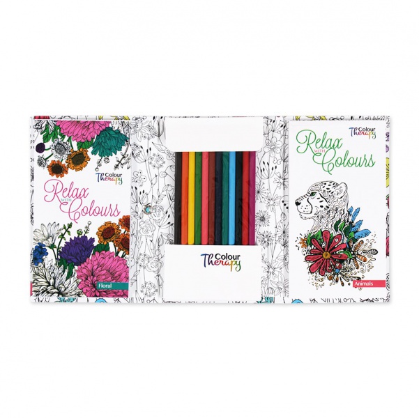 Antistresové omalovánky v cestovním kompaktním balení lze jednoduše zavřít gumičkou a uvnitř naleznete přihrádku s 12 barevnými pastelkami.