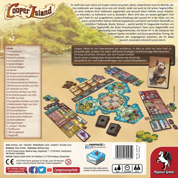 You've come to make your fortune on Cooper Island, whose untouched peninsulas stretch out like long arms into the wild Atlantic. With two ships and a few workers, each of you has landed on a separate peninsula, which you hope to explore, cultivate, and settle. But who will do this best? And how? Will you expand your land quickly, or will you instead spend your efforts cultivating it, making it more and more valuable and productive?