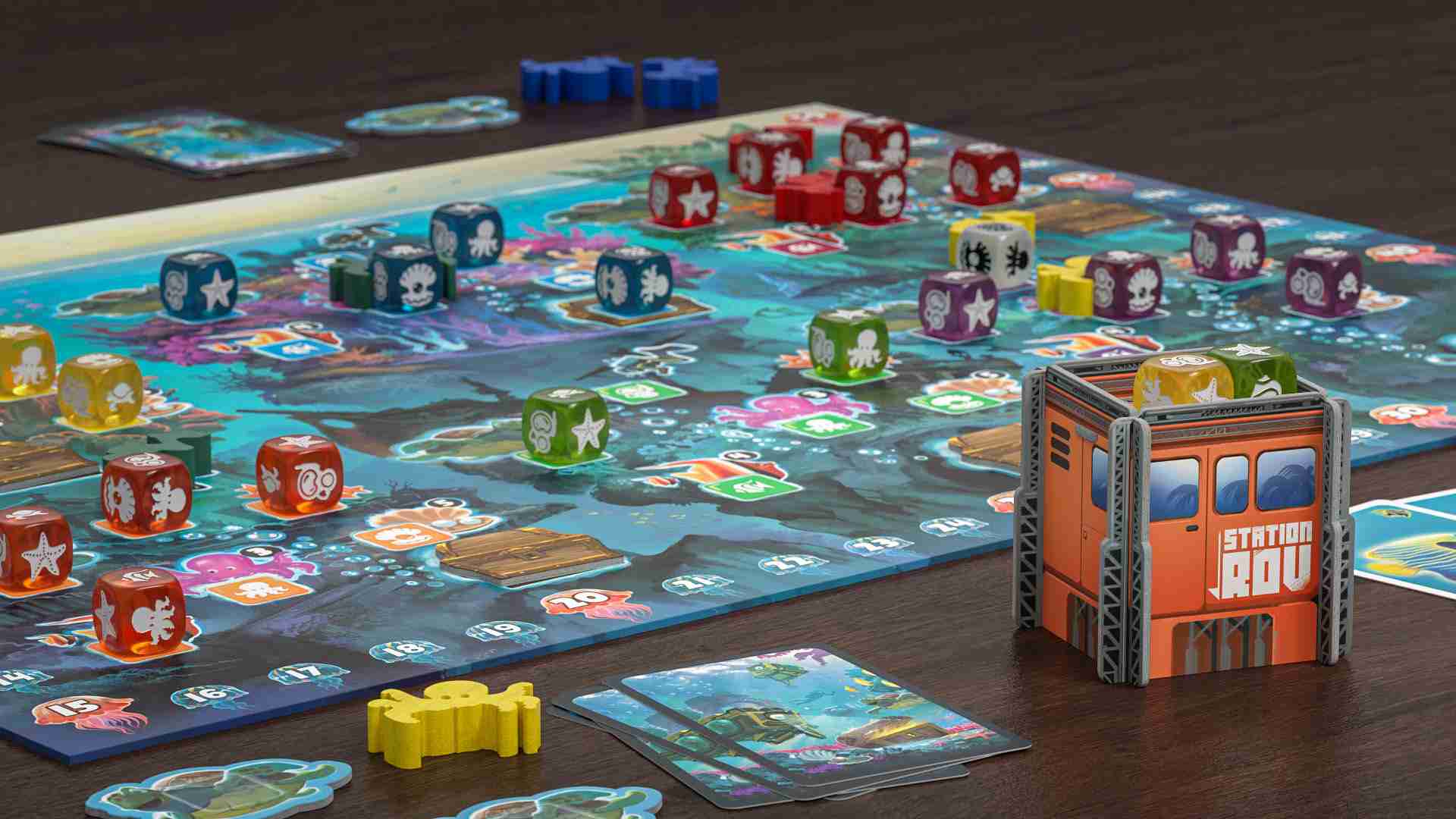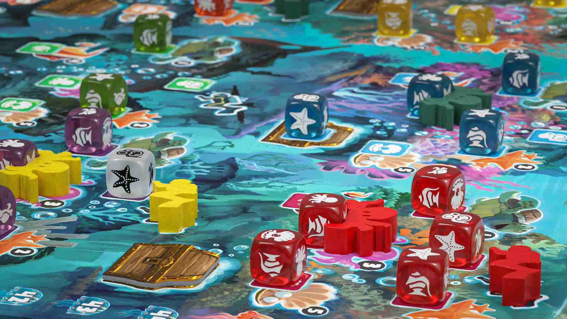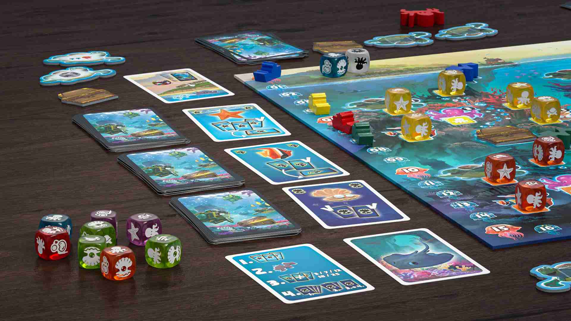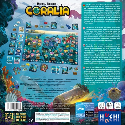 The colorful reefs around the former pirate island of Coralia provide a paradise for scientists from all over the world who explore the underwater world with their diving robots and work on the preservation of the coral reefs. They send their ROVs (Remotely Operated Vehicles) into the depths of the sea in order to find certain species. Moreover, they also keep their eyes open in case they can find a sunken pirate's treasure or two. A few pearls would be welcome, too, so that they won't be just a renowned explorer in the end, but also a wealthy one ... In this dice-placement game, each player tries to make the most points with a bit of luck and the right decisions – an adventure for the entire family.