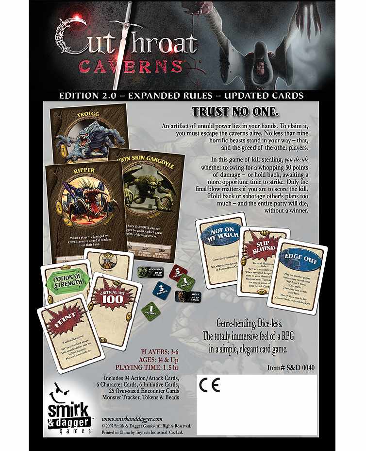 Cutthroat Caverns is truly unique. While most definitely a highly interactive card game and very easy to play, it requires the strategic thinking of a board game. And, for some uncanny reason, the game will make you FEEL like you are in the middle of a classic dungeon crawl, even though table talk is about as much roleplaying as you are likely to do. That all said, it has proven to have a very broad appeal with gamers across several genres.
