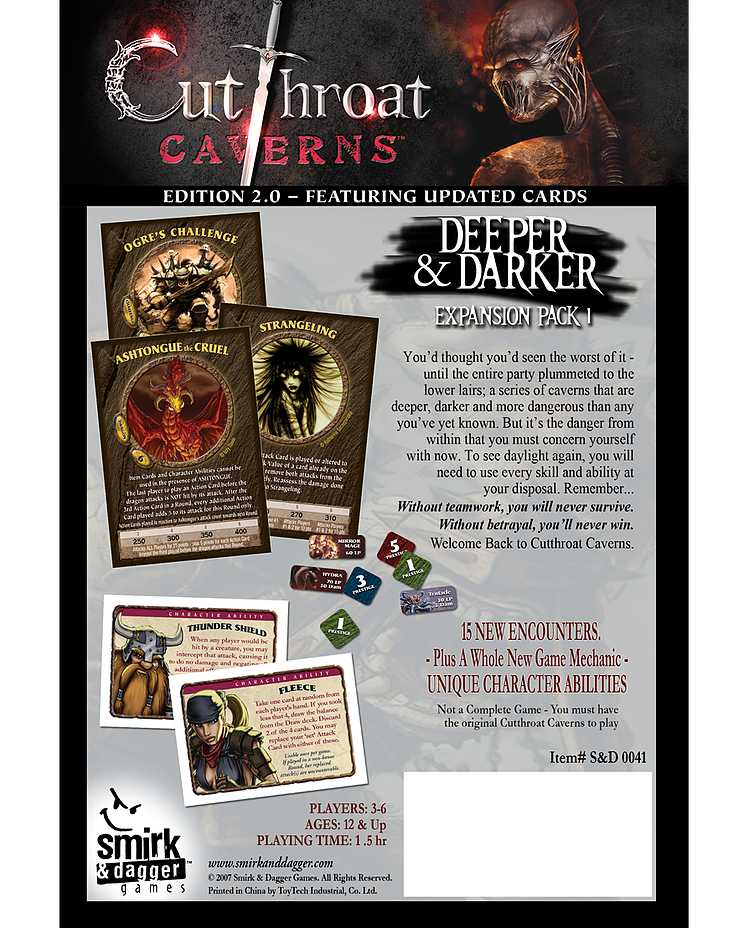 Deeper & Darker is the first expansion to Cutthroat Caverns and further extends replay value with 15 new Encounters. Like in the core set, these Encounters all have a very different feel and require new strategies to overcome - both as a group and as an individual. As is implied by the title, these new critters are more challenging than ever and will put your party to the test. You may find yourself playing backwards in time against PARADOX, be tempted one too many times by ASHTONGUE THE CRUEL, or find that seven heads are not better than one with the HYDRA.