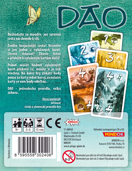 Rozhodujte se moudře, jen správná cesta vás dovede k cíli. Zvolíte bezpečnější cestu? Vezměte si jen jednu z vyložených karet. Chcete riskovat? Zkuste štěstí a přidejte k vyloženým kartám další! Pokud součet hodnot vyložených karet překročí 12, musíte si je vzít všechny. Na konci hry získáte body pouze za karty jedné barvy, za ostatní karty se vám body odečtou. DAO - jednoduchá pravidla, velká zábava.