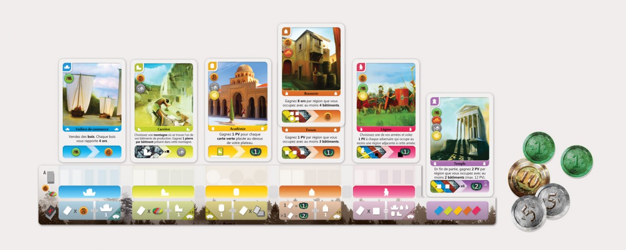 Karty jsou v šesti barvách, každá z barev je zástupcem pro konkrétní oblast: červená pro armádu, zelená pro získání zdrojů, modrá pro obchod, hnědá pro bodování, fialová pro chrámy a žlutá pro různé efekty.