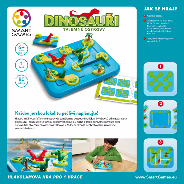 Hlavolam Dinosauři: Tajemné ostrovy je zaměřen na bezpečné oddělení býložravců od masožravých dinosaurů. Prokousejte se skrz 80 zajímavých rébusů, v nichž je třeba důmyslně rozmístit části ostrovů tak, aby červení masožraví T-Rexové v žádném případě neohrožovali mírumilovné zelené býložravce.