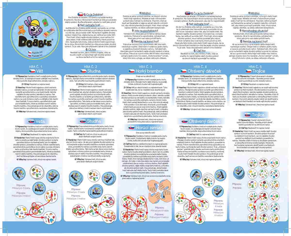 Hra nabízí zcela unikátní zábavu. Hráči zde hledají dva stejné symboly na kartách při různých verzích hry (v pravidlech je popsáno celkem 5 her). Super jsou kulaté karty i jednoduchá pravidla vysvětlená doslova za pár sekund. Cílová skupina jsou děti i rodiče - všichni, kdo se chtějí pořádně bavit a nemají čas pročítat dlouhá pravidla. Plechová krabička zaručuje bezpečí karet a jednoduše umožňuje mít hru vždy u sebe. Vyzkoušejte i Vy postřehový fenomén Dobble a jistě budete překvapeni, jak i tak jednoduchá hra může být zábavná!