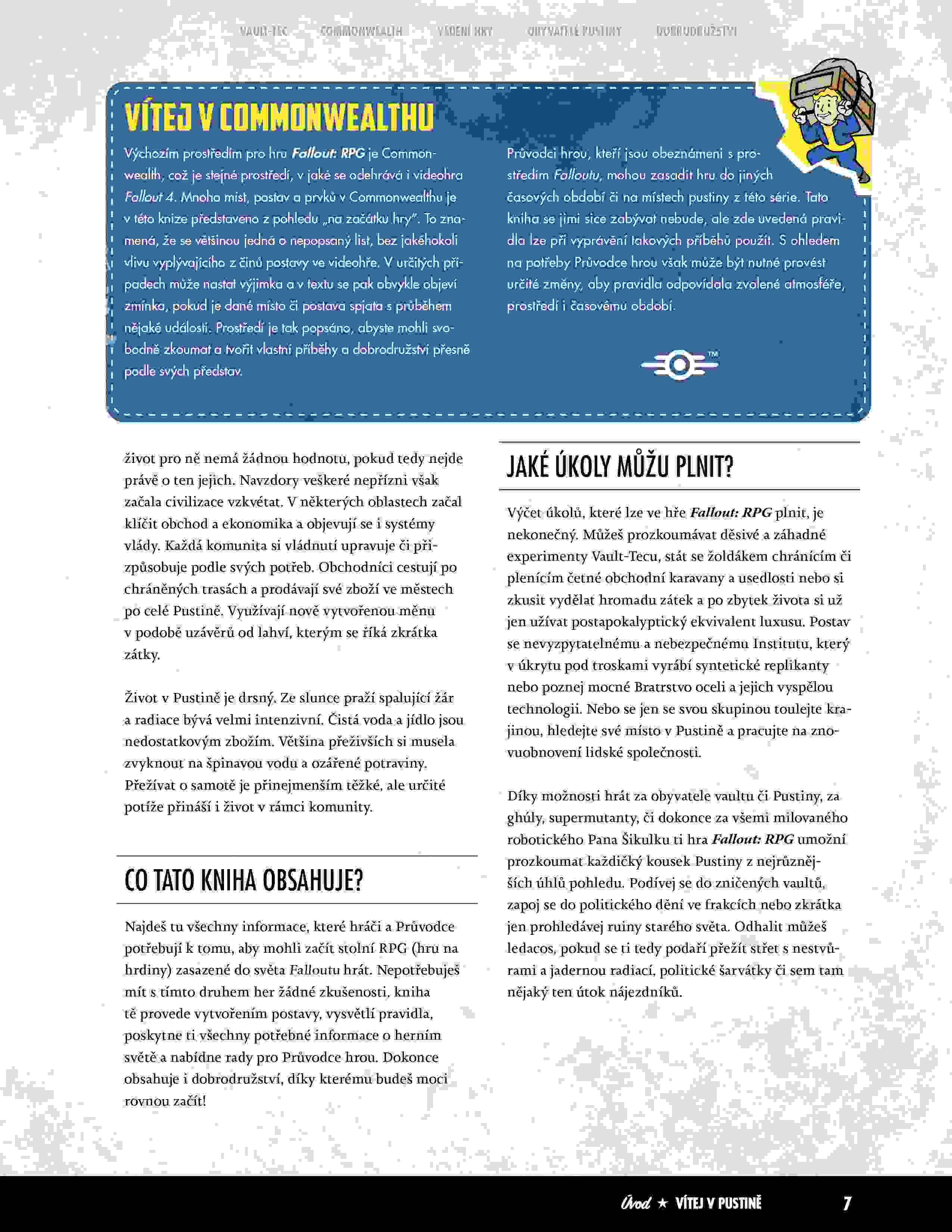 V pravidlech najdeš kompletní nástroje pro tvorbu postavy – můžeš hrát za člověka, ghúla, supermutanta nebo robota. Čeká tě rozsáhlý bestiář, ikonické vybavení, craftování i úpravy zbraní, které znáš ze hry. Jako Game Master oceníš generátory náhodných setkání, lokací a úvodní dobrodružství, díky kterým se můžeš rovnou pustit do hraní.