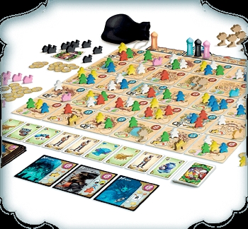 Designed by Bruno Cathala, Five Tribes builds on a long tradition of German-style games that feature wooden meeples. Here, in a unique twist on the now-standard “worker placement” genre, the game begins with the meeples already in place – and players must cleverly maneuver them over the villages, markets, oases, and sacred places tiles that make up Naqala. How, when, and where you dis-place these Five Tribes of Assassins, Elders, Builders, Merchants, and Viziers determine your victory or failure.
