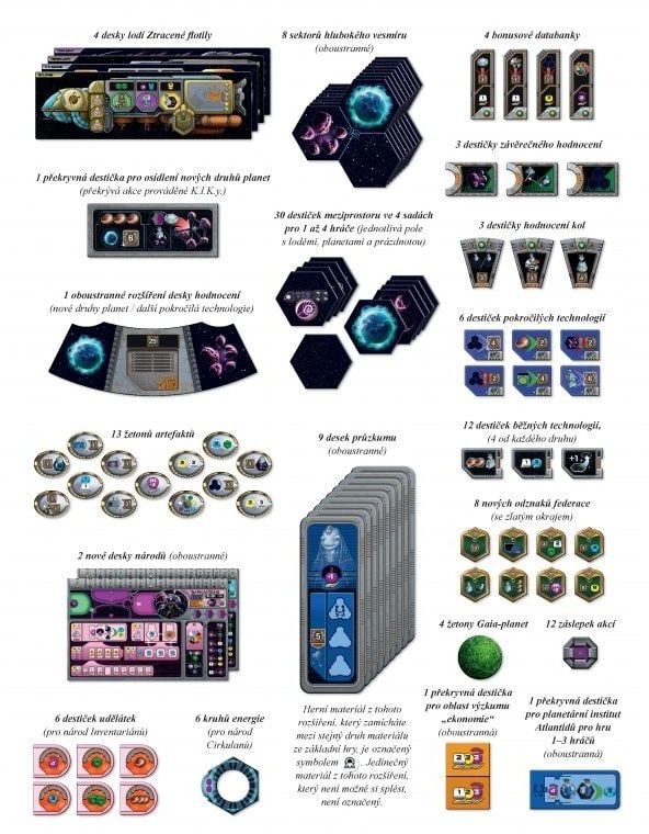Rozšíření přináší také mnoho dílků a destiček doplňující ty ze základní hry. Najdete zde nové základní a pokročilé technologie, nové bonusové databanky, destičky závěrečného hodnocení a hodnocení kol, nové odznaky federace, variabilní stupnici ekonomie.