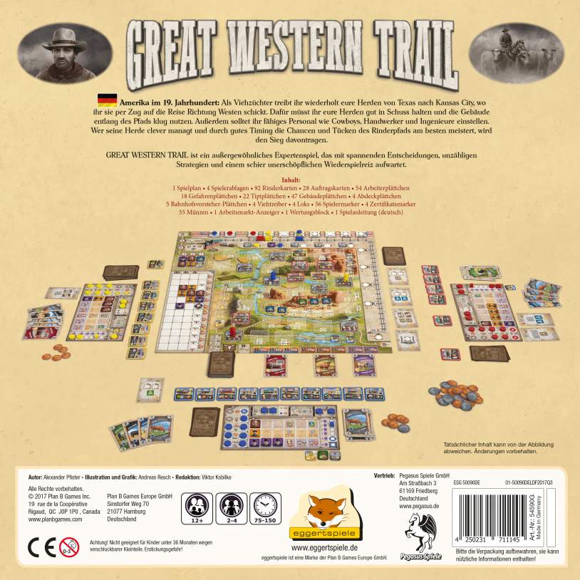 Amerika 19. století. V roli rančera pravidelně ženete svá stáda z Texasu do Kansas City, kde je nakládáte na vlak. Musíte zvířata udržovat v dobrém stavu a důmyslně využívat budov podél cesty. Také si potřebujete najímat schopné muže – kovboje, řemeslníky a inženýry. Dokážete-li se o svá stáda dobře postarat, využijete-li chytře nabízených příležitostí a vyhnete-li se nebezpečným nástrahám cesty, určitě zvítězíte. Great western trail je mimořádná hra pro vyspělé hráče nabízející velké strategické možnosti, ve které budete muset přijímat nelehká rozhodnutí.