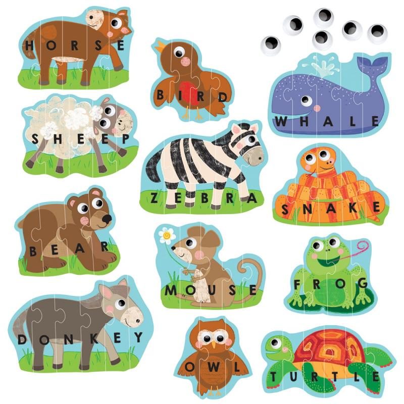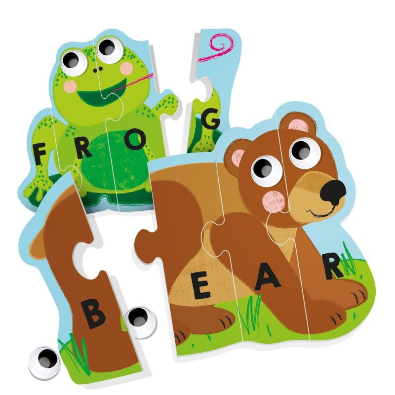 Sestavte dohromady samo-opravné puzzle a naučte se, jak číst a psát svá první slova. Navíc můžete vylepšit a oživit zvířátka přidáním nalepovacích očí.