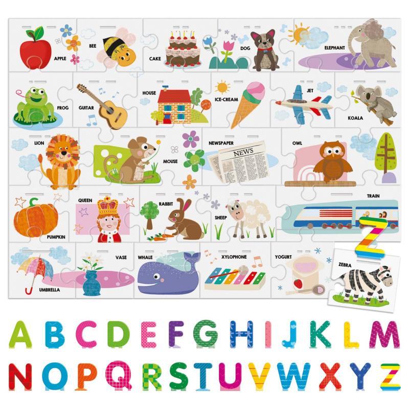 Obří puzzle s velkými vytvarovanými písmenyDěti mohou sestavit velkou ilustrovanou skládačku a naučit se rozpoznávat abecedu a první slova díky originálně vytvarovaným písmenům, jež se svisle vkládají do obrázku.