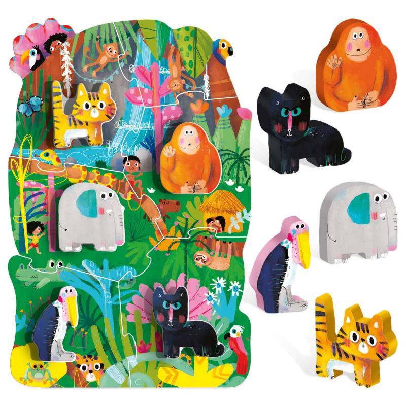 Díky těmto stimulům si děti prohlubují dovednosti, které podporují jejich kognitivní vývoj v předškolním věku. Děti sestaví džungli složenou ze 6 kusů a poté do otvorů vkládají 5 roztomilých dřevěných zvířátek, která musejí umístit na správné místo podle jejich tvaru.