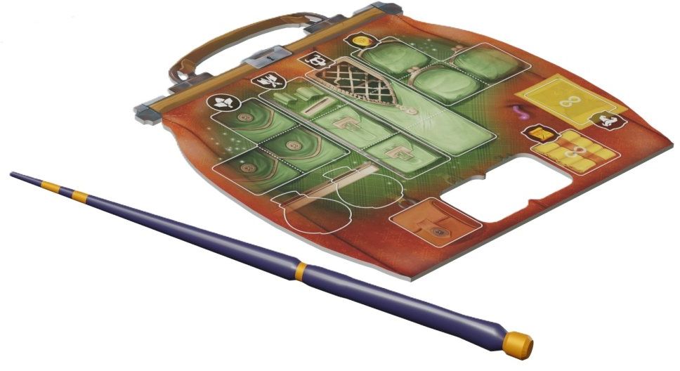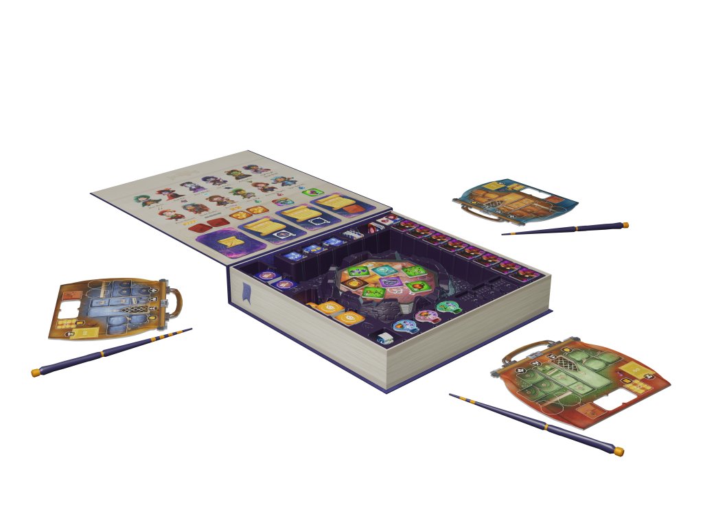 Hra přichází v unikátní krabici ve tvaru knihy, která zároveň slouží jako herní plán s věží a vodním příkopem. Obsahuje desítky žetonů, karet kouzel, kouzelné hůlky různých sil a oboustranné kufry pro základní i expertní režim. Díky variabilní přípravě a náhodnému rozložení místností je každá hra jiná.
